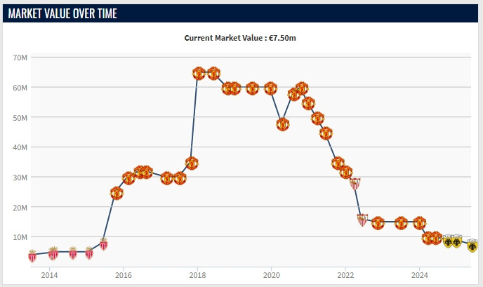 Năm 2015, Martial 19 tuổi gia nhập Manchester United với mức phí chuyển nhượng 60 triệu euro và giành giải Cậu bé vàng châu Âu năm đó. Năm 2018, giá chuyển nhượng người Đức của Martial đạt đỉnh cao trong sự nghiệp, lên tới 65 triệu euro. Hiện Martial 29 tuổi đã ở xa 5 giải đấu lớn và chỉ có giá trị 7,5 triệu euro.