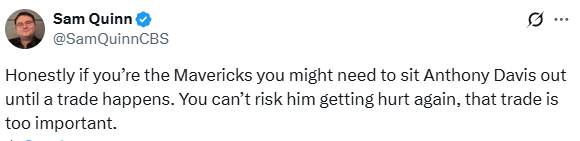 Nói về triển vọng thương mại của lông mày rậm, phóng viên Sam Quinn của NBA cho biết: Đối với Mavericks, Anthony Davis có thể được phép tạm thời nghỉ ngơi cho đến khi giao dịch hoàn tất. Bạn không thể mạo hiểm để anh ấy bị thương lần nữa, thương vụ này quá quan trọng.