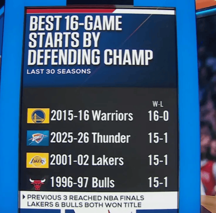 Ngoài ra, Thunder đã đạt được thành tích 15 trận thắng và 1 trận thua trong 16 trận đầu tiên, đây là thành tích tốt thứ hai mà nhà đương kim vô địch đạt được ở mùa giải thứ hai trong vòng 30 năm qua, chỉ đứng sau Warriors ở mùa giải 2015-16 (16 trận thắng và 0 trận thua). Điều đáng chú ý là trong số các nhà đương kim vô địch có ít nhất 15 trận thắng trong 16 trận đầu tiên trong 30 năm qua, Lakers ở mùa giải 2001-02 (15 thắng và 1 thua) và Bulls ở mùa giải 1996-97 (15 thắng và 1 thua) đều giành chức vô địch.