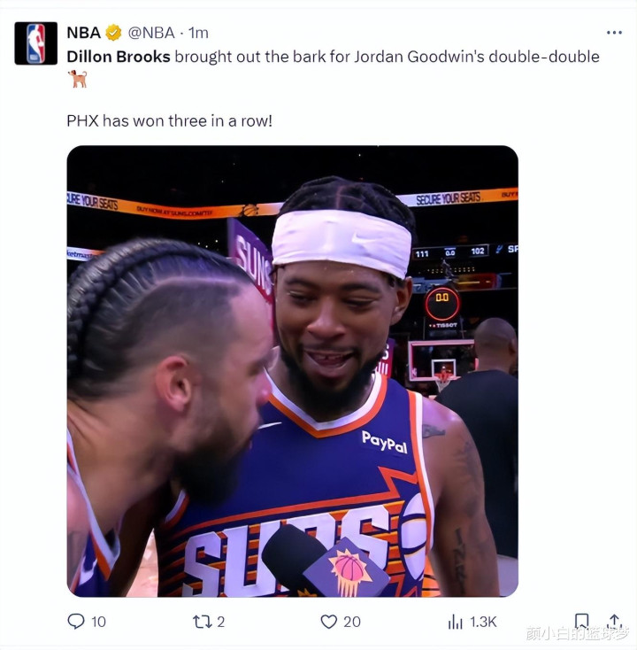 Sau trận đấu, các phóng viên chính thức của NBA đã phỏng vấn Goodwin, người có 15 điểm, 10 rebound, 3 kiến tạo, 1 cướp bóng và 0 lần chuyển bóng. Dillon lao vào và sủa anh ta một cách rất thú vị. Hai người nhìn nhau mỉm cười rồi bắt tay, vỗ ngực. Không khí trong phòng thay đồ của Suns rất tốt.